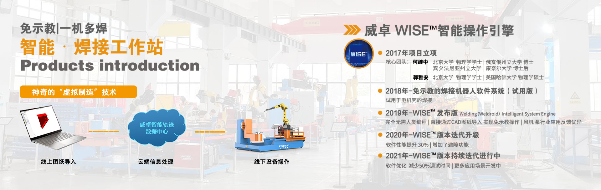 無錫威卓智能機器人有限公司成立于2017年,是無錫市政府引進的科技領軍型高新技術企業,公司研發(fā)團隊80余人,我們堅持自主創新,利用自主開發(fā)的虛擬制造技術對傳統焊接行業進行升級改造。 公司主推的工業風機系列-智能焊接工作站產品,具有免示教、實時跟蹤、簡易工裝、傻瓜式操作等優(yōu)點,真正幫助企業解決了招焊工難,用工成本高,焊接質量不穩(wěn)定等問題。